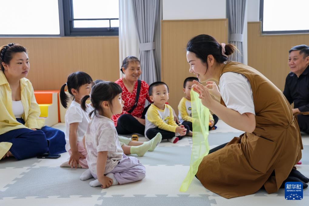 4月16日,在深圳市龙岗区平湖街道良安田社区党群服务中心设立的免费托育点,老师通过龙岗特色的“龙宝小剧场”为宝宝表演绘本故事。新华社记者 毛思倩 摄
