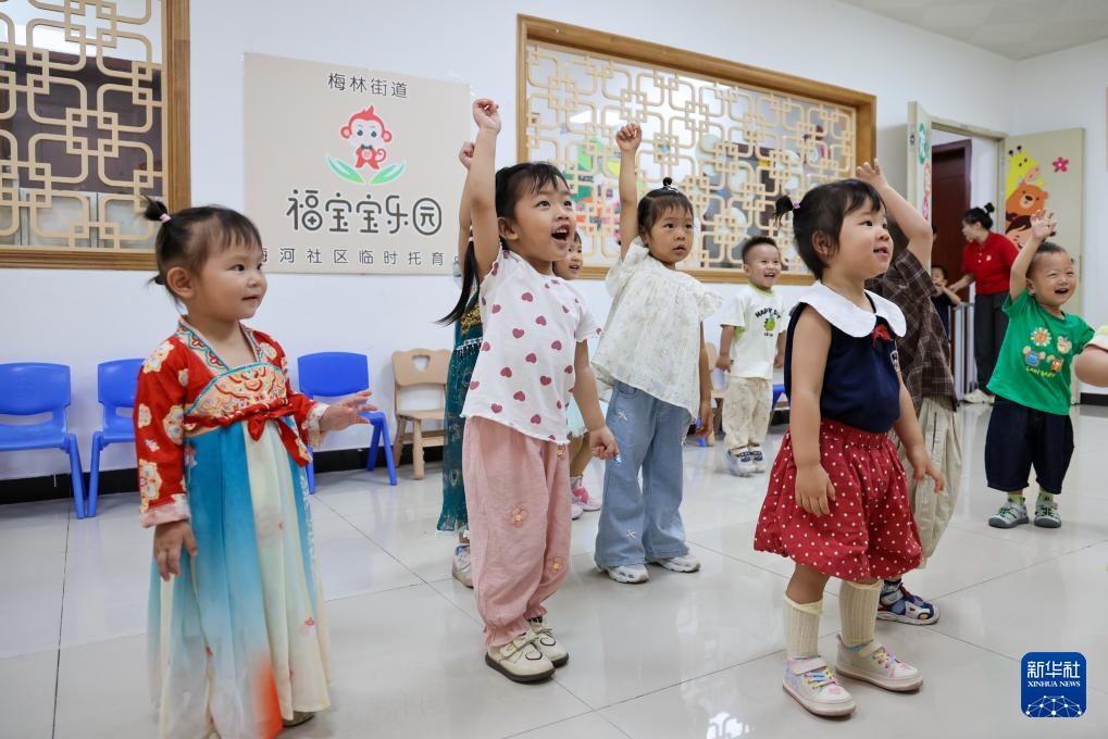4月17日,在深圳市福田区梅林街道梅河社区党群服务中心内的“福宝宝乐园”托育点,孩子们跟着音乐做早操。新华社记者 梁旭 摄