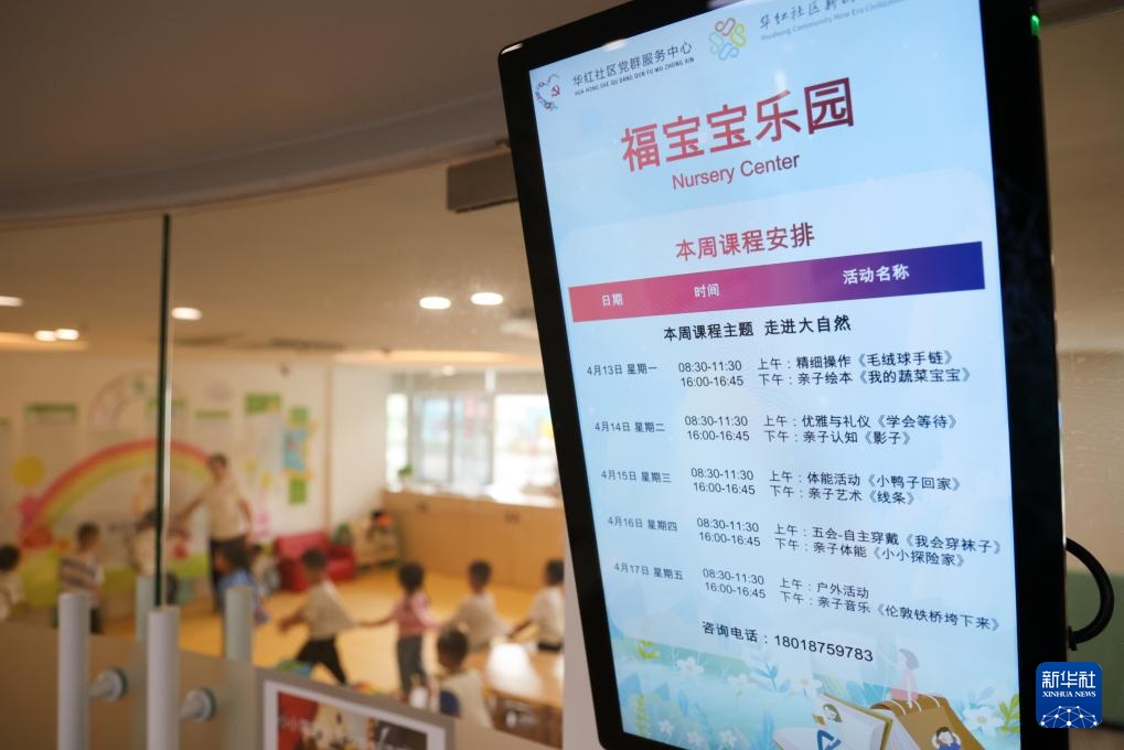 4月17日,在深圳市福田区华强北街道华红社区党群服务中心内的“福宝宝乐园”托育点,屏幕上显示一周课程安排。新华社记者 梁旭 摄