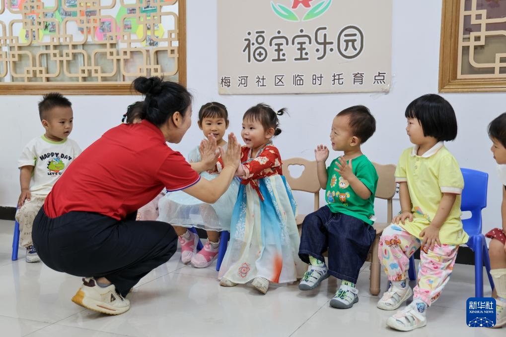 4月16日,在深圳市龙岗区平湖街道良安田社区党群服务中心设立的免费托育点,老师与孩子一起互动游戏。新华社记者 毛思倩 摄