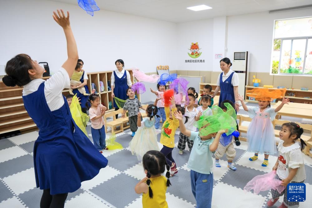 4月15日,在深圳市龙华区民治街道民康社区“一老一小”综合服务站,恩乐儿托育园的老师在陪孩子们做游戏。新华社记者 梁旭 摄