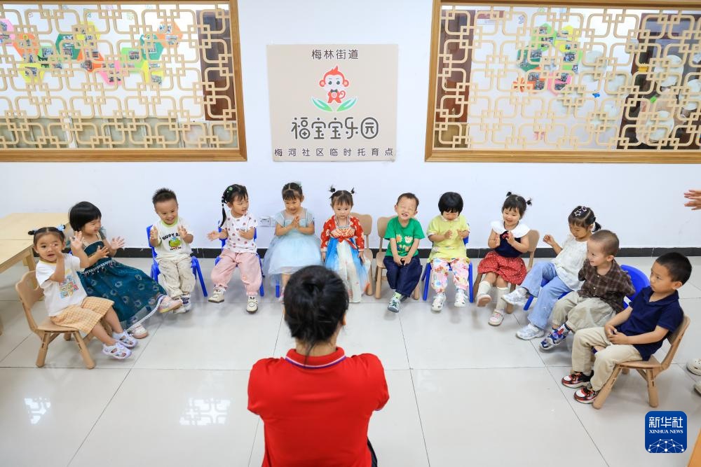 4月17日,在深圳市福田区梅林街道梅河社区党群服务中心内的“福宝宝乐园”托育点,孩子们在老师的带领下做游戏。新华社记者 梁旭 摄