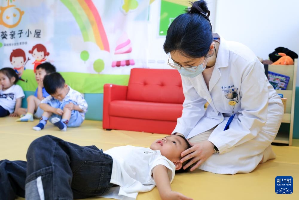 4月17日,在深圳市福田区华强北街道华红社区设立的托育点,华红社区健康服务中心的医生为托育点儿童进行推拿。新华社记者 毛思倩 摄